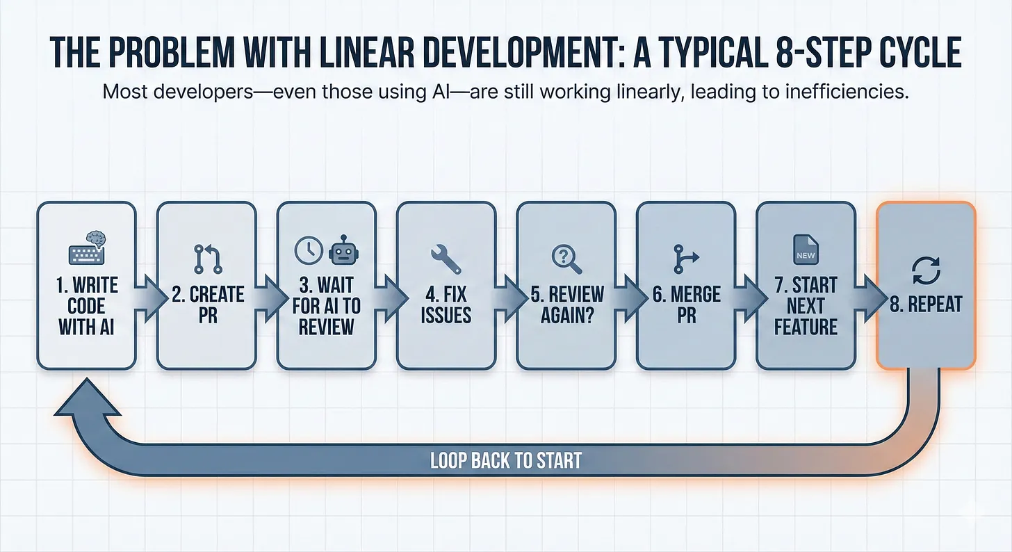 See the bottleneck? You’re sitting idle while waiting for review. You’re treating code review as a gate instead of a parallel process.
